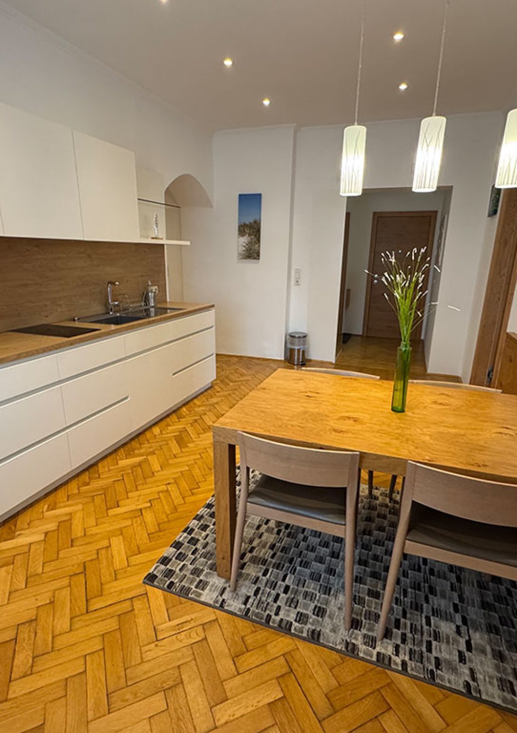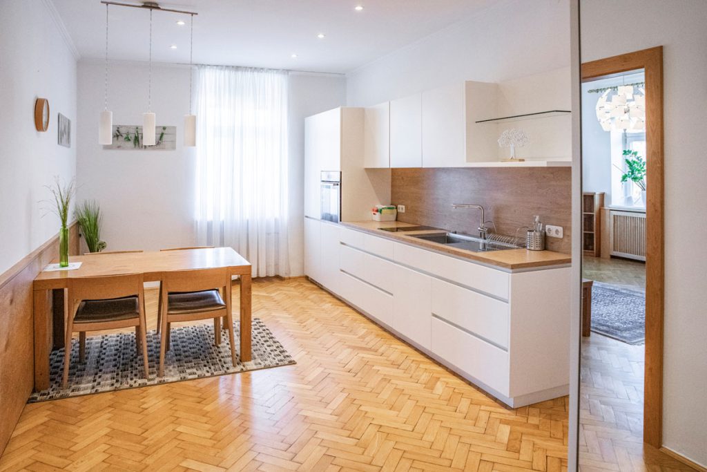 Das Herzstück des Apartments bildet ein helles Wohnzimmer mit einer ausziehbaren Couch, die als zusätzlicher Schlafplatz für zwei Personen genutzt werden kann. Angrenzend befindet sich eine komplett ausgestattete Küche sowie ein einladender Essbereich, in dem gemeinsame Mahlzeiten gemütlich genossen werden können.
